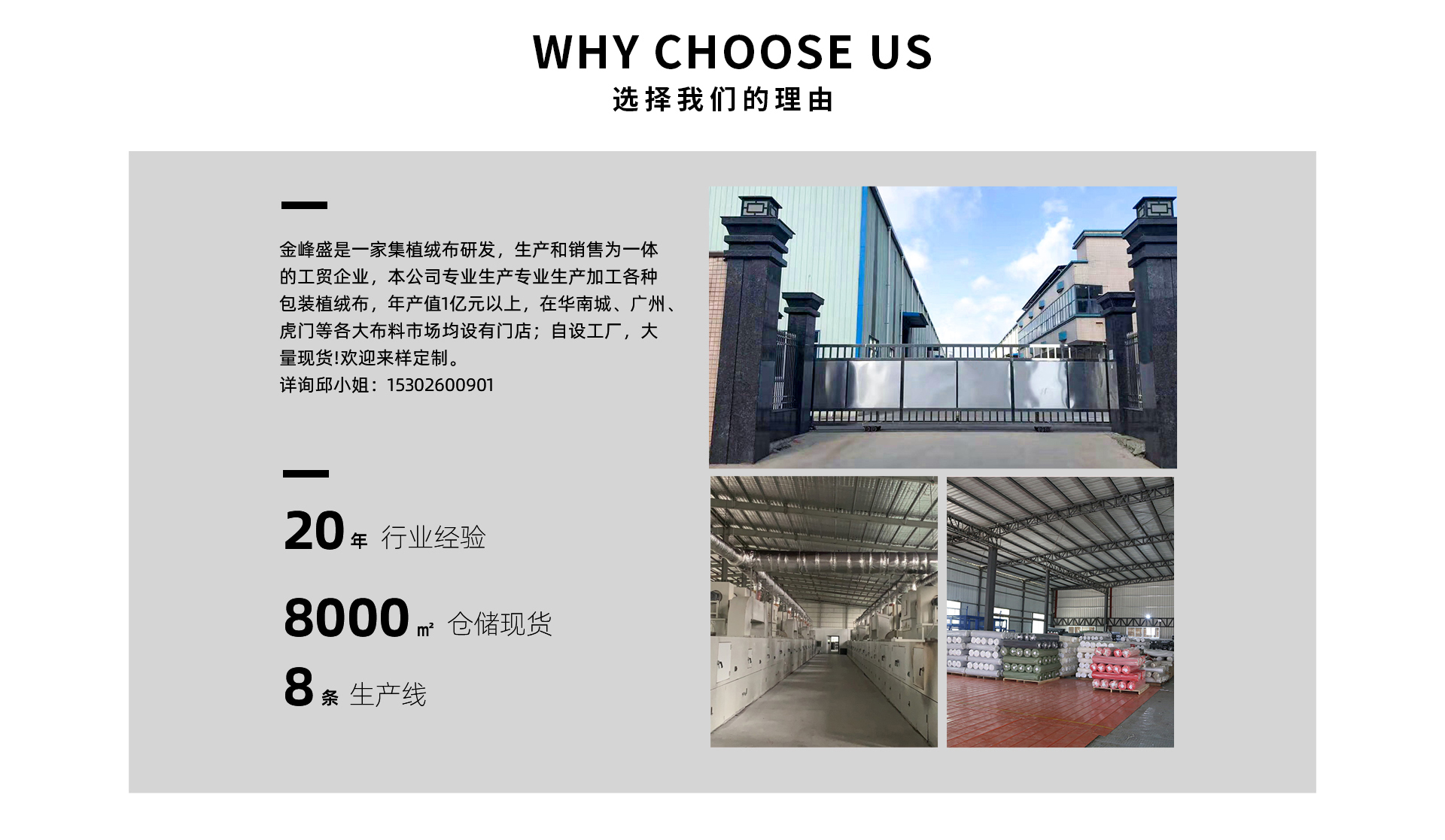 [查看详情]我找植绒布供应商的时候,有个朋友介绍金峰盛公司,作为批发商,质量当然很重要,但是价格实惠和市场心理好才有...